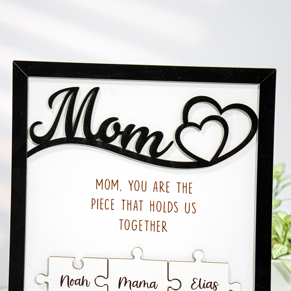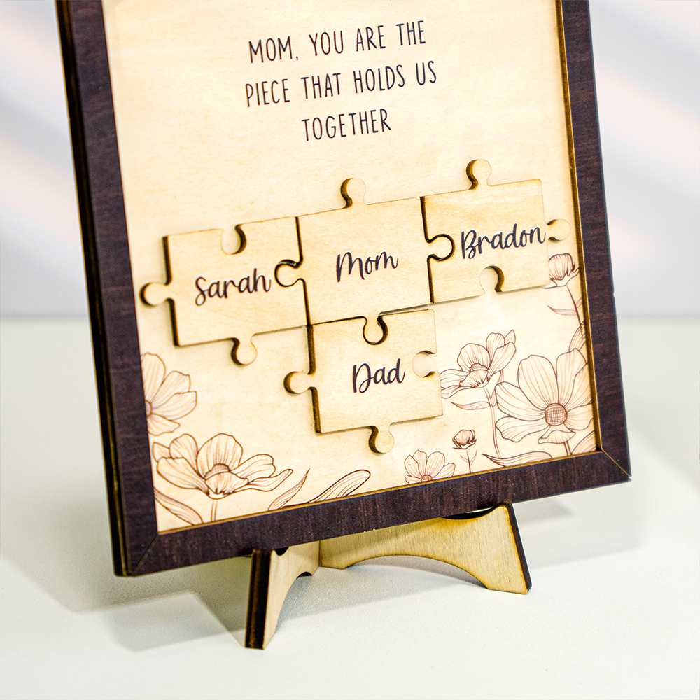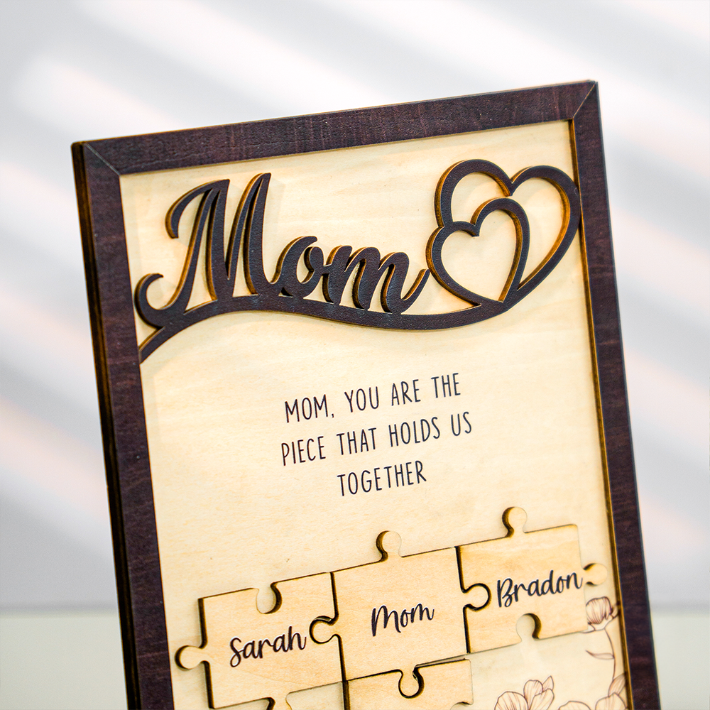 Mom Puzzle Sign With Holder, Mother's Day Gift From Kids, Personalized Unique Engraved Wood Sign