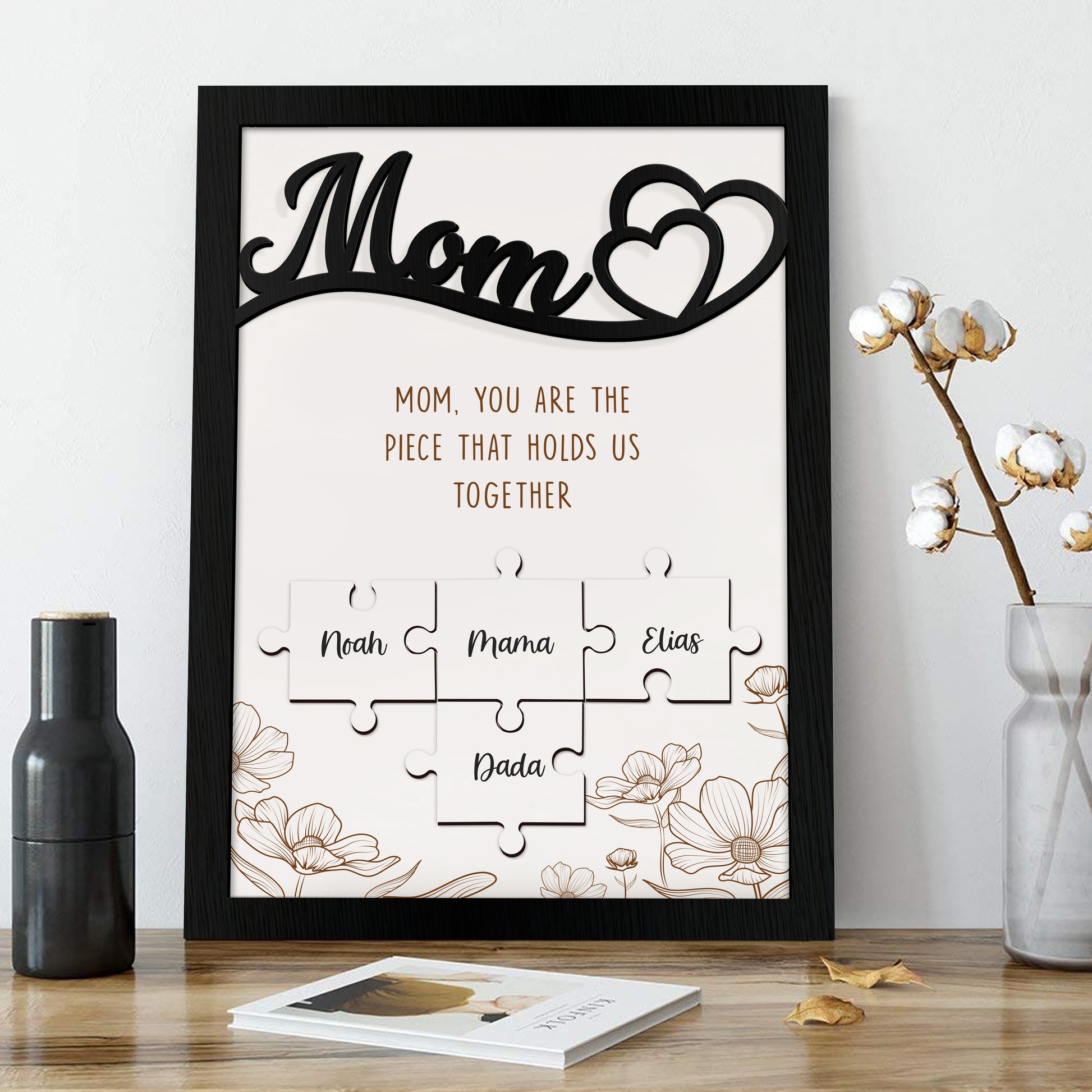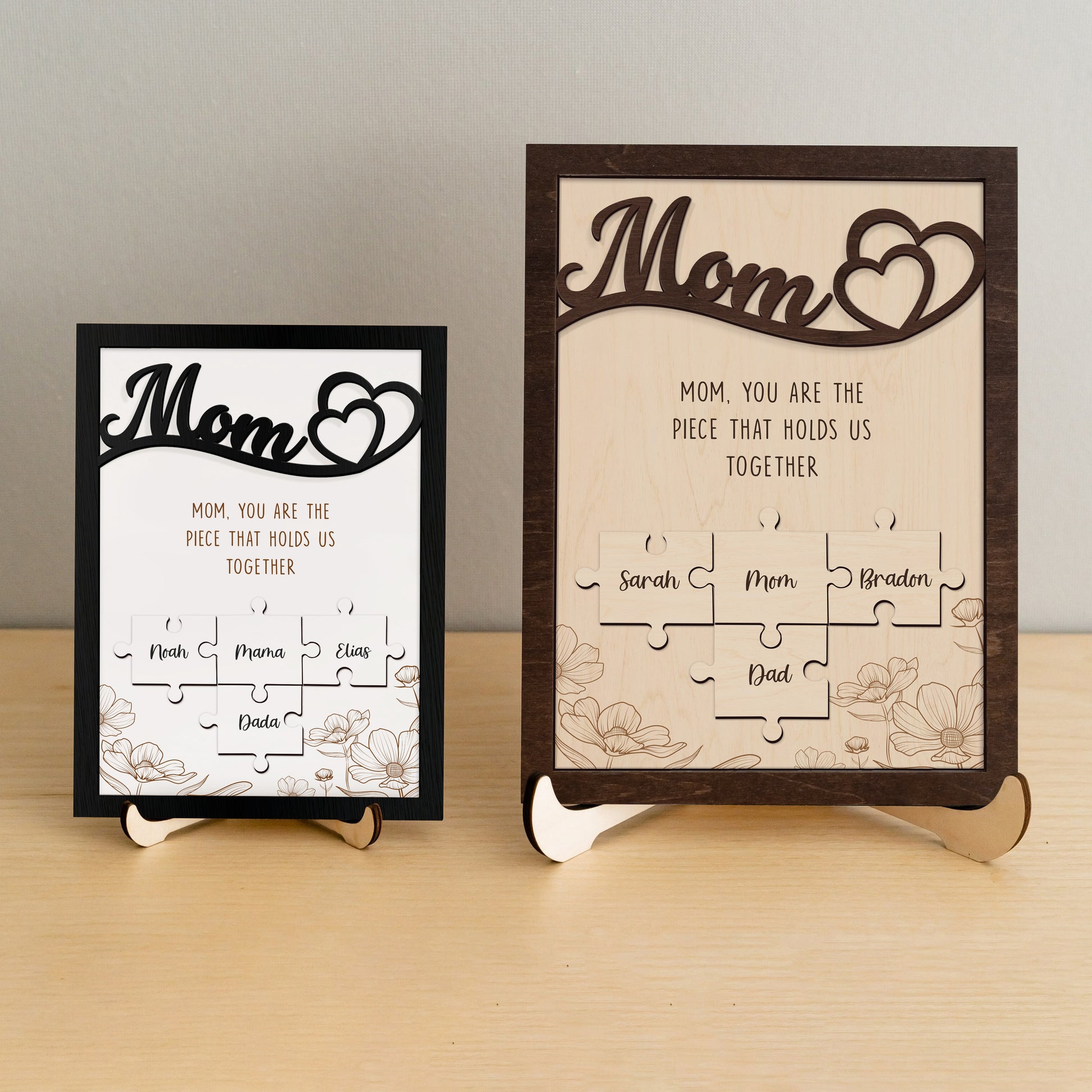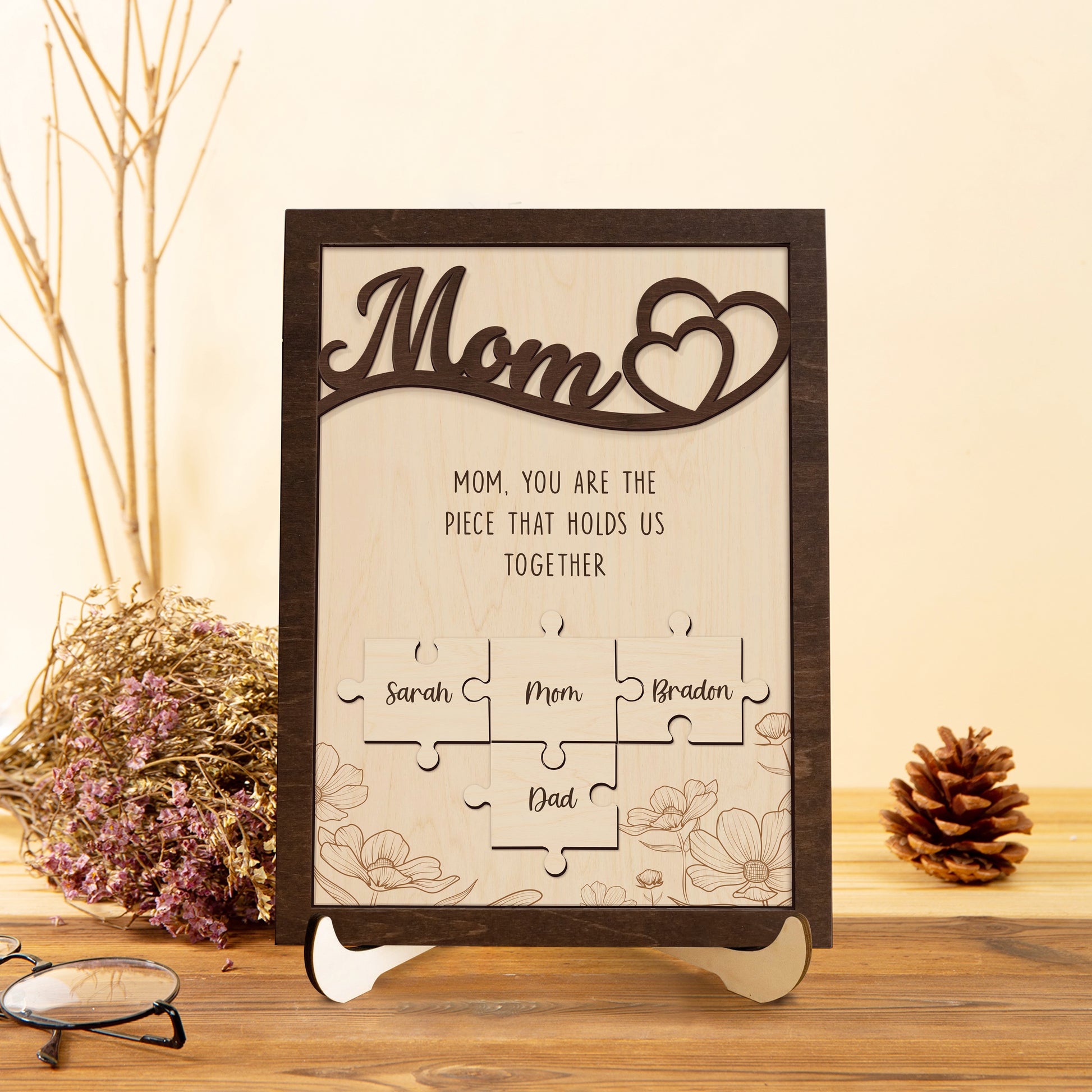 Mom Puzzle Sign With Holder, Mother's Day Gift From Kids, Personalized Unique Engraved Wood Sign