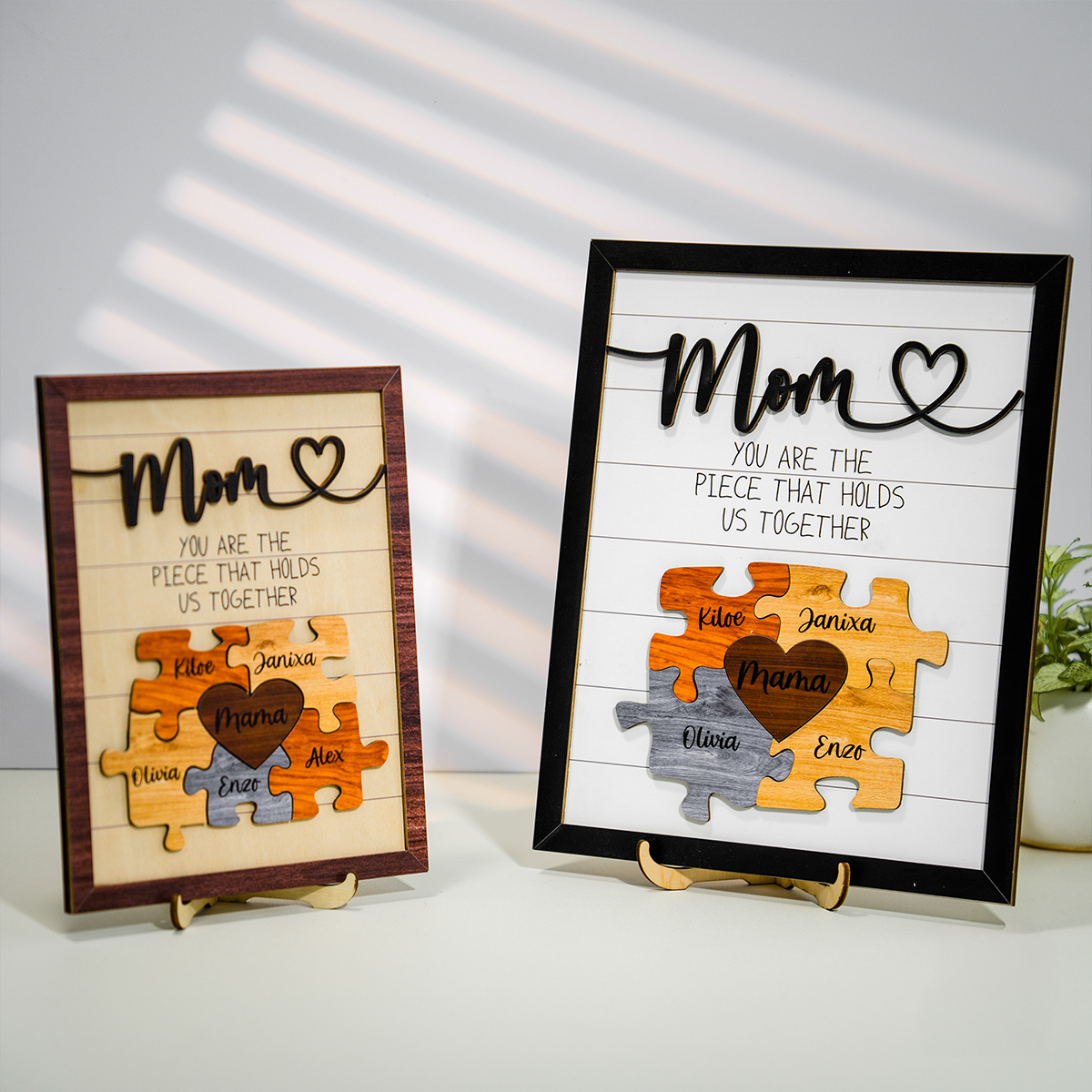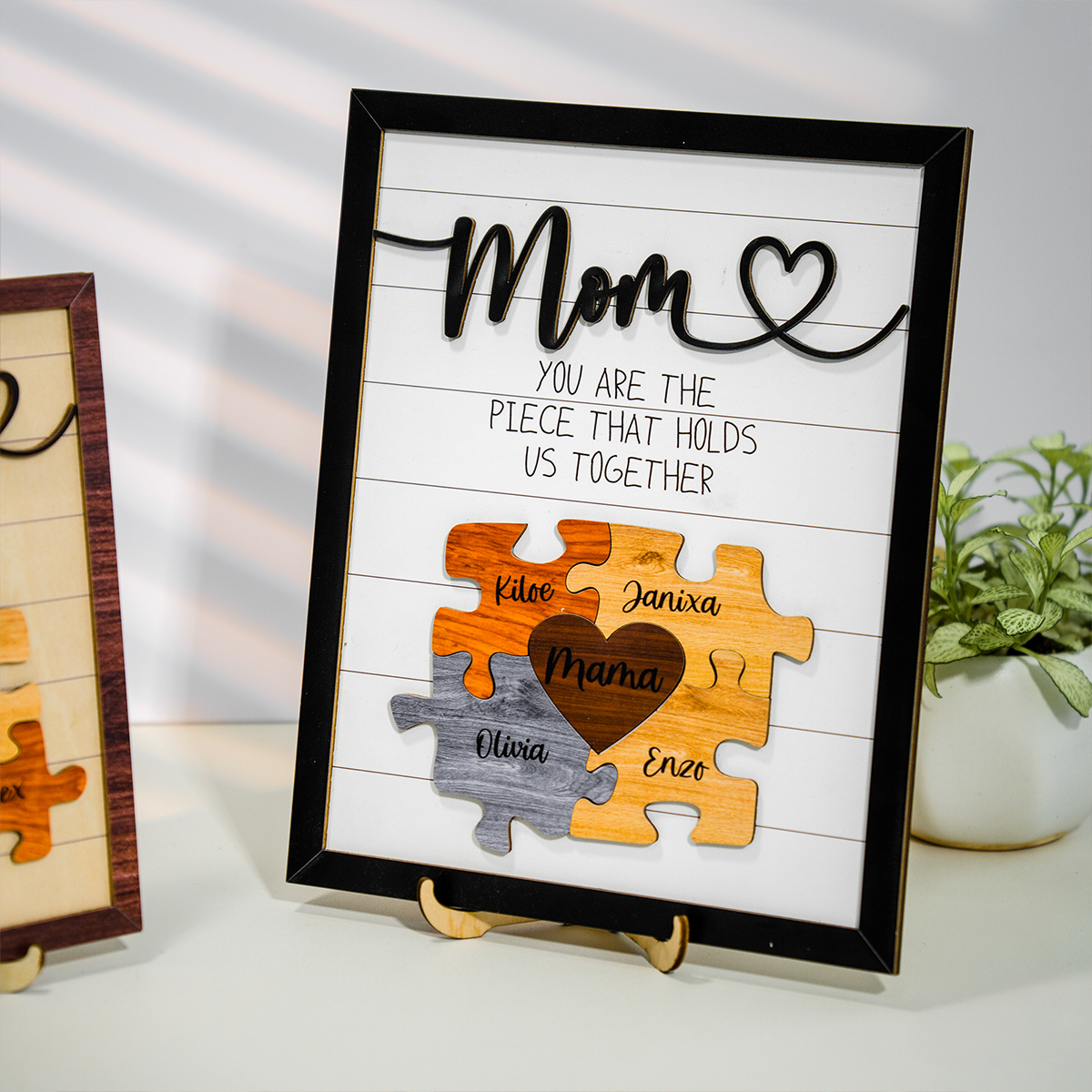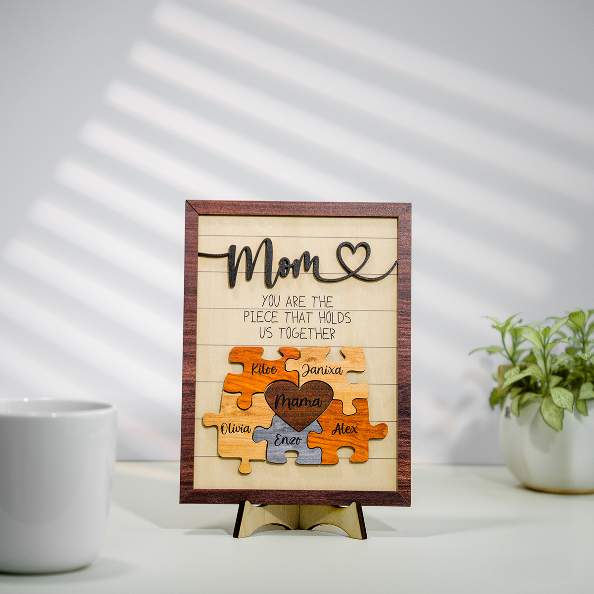 Mom Puzzle Sign With Holder, Mother's Day Gift From Kids, You Are The Piece That Holds Us Together, Personalized Unique Engraved Wood Sign